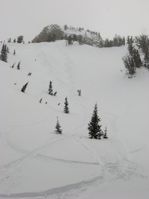 After skiing a great tracked up run, we decided to push a little further east along the mountain, in search of fresh pow that hadn't been pillaged yet. Didn't take long before we discovered massive quantities of untouched powder fields.