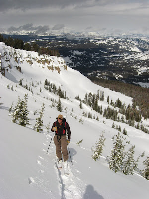 I had a pass left to use at the Resort in Jackson before they closed. Since they were getting hammered with new snow, I figured it was a good time to go. Matt had some days to burn as well, so he agreed to come come with and introduce me to just a little of the backcountry skiing available outside of the resort boundaries. There's lots of traversing and side-stepping required to get to it all, so I decided to bring my skis. I haven't skied much this year. It was obvious.